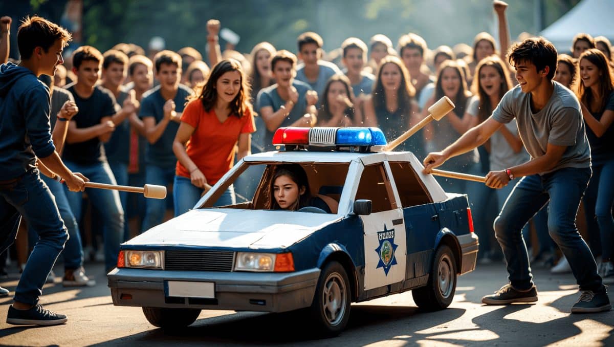 Secondo le immagini diffuse sui social, la scenografia riproduceva un veicolo della polizia con la scritta POLICE. Parte degli studenti, spesso bendati, ha preso a bastonate il cartone durante un evento pubblico. La modalità riprende la tradizione della pentolaccia, ma il soggetto scelto ha reso la scena controversa.